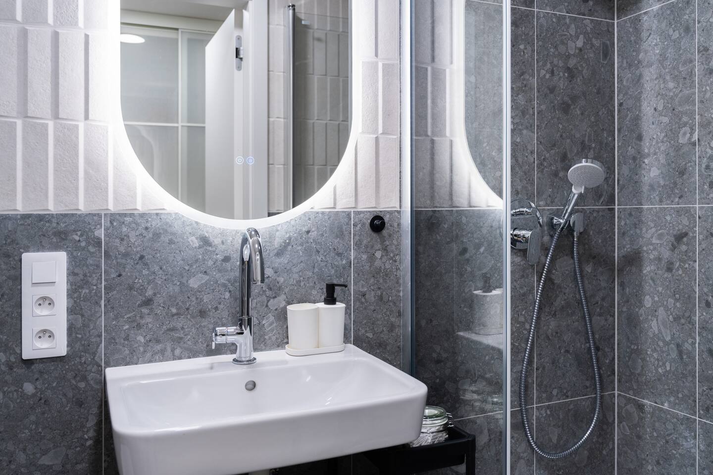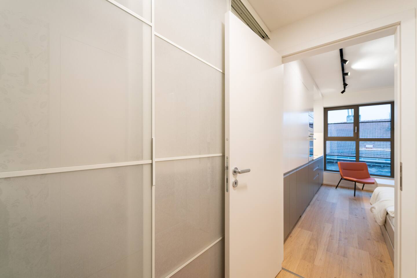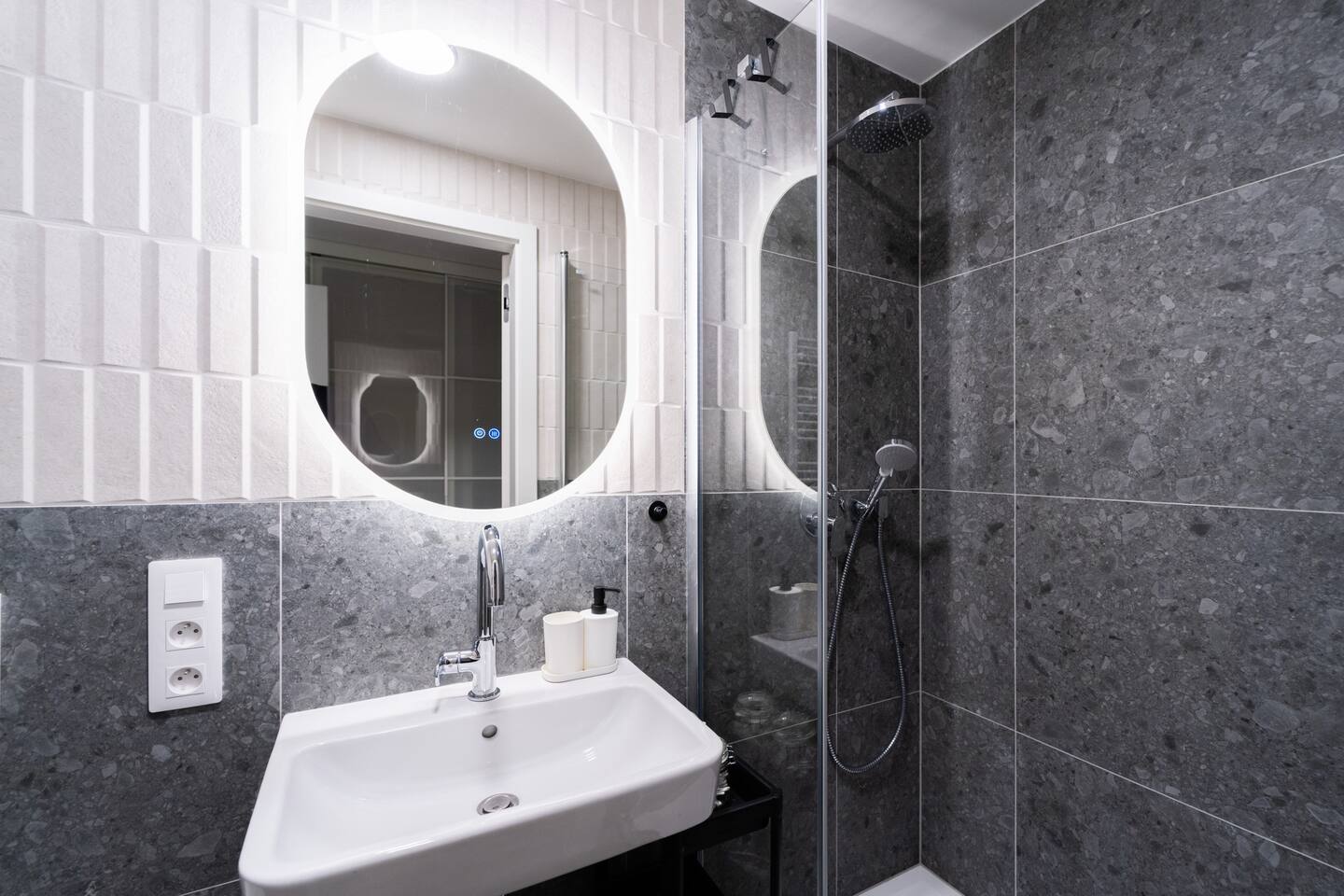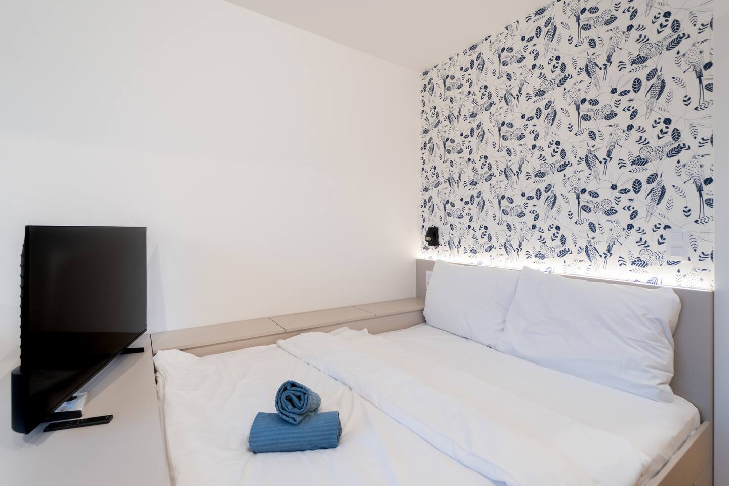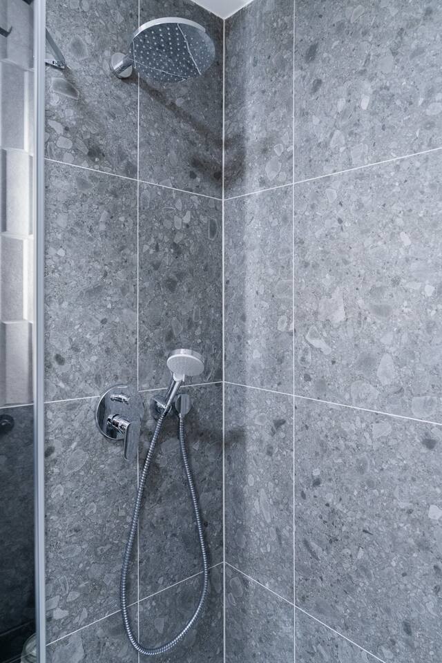 The studio includes a complete kitchen, washer, high-speed Wi-Fi and TV. The private bathroom features a modern shower. Indigo’s colour palette gives the space a relaxed, quiet character—ideal for unwinding after exploring Brno.