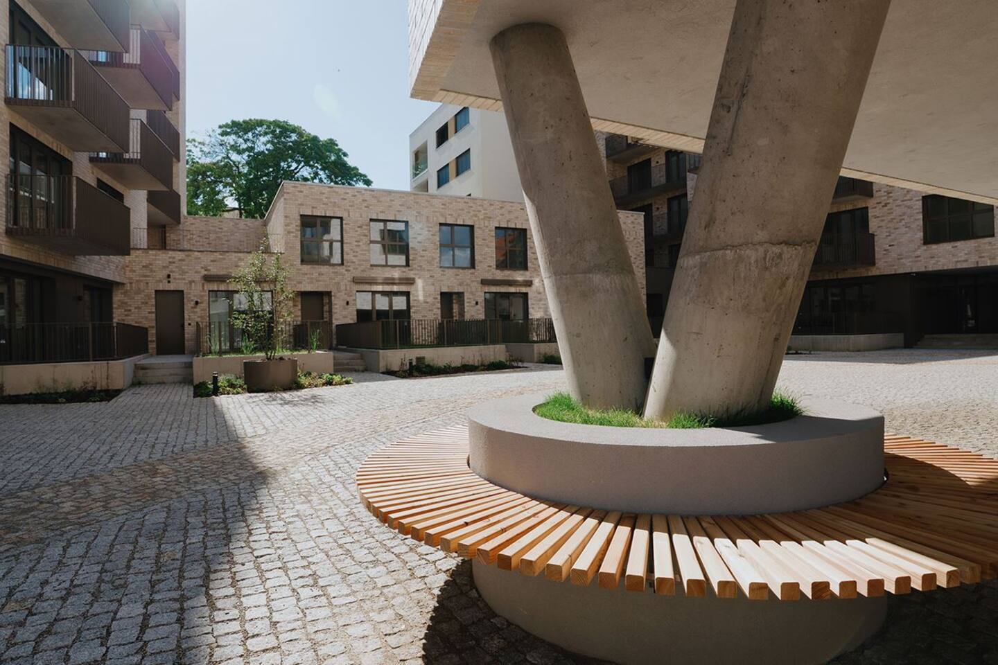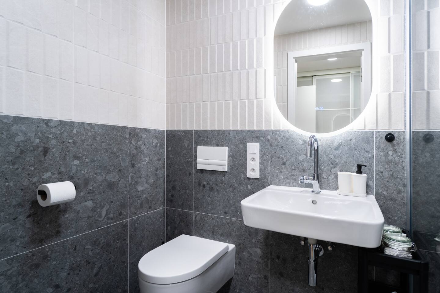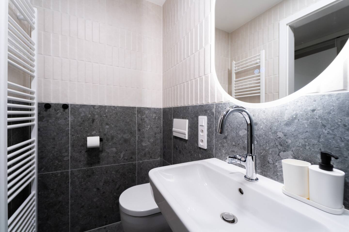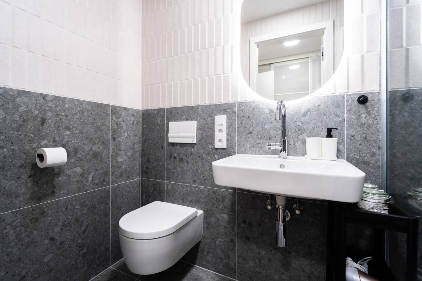 The studio includes a complete kitchen, washer, high-speed Wi-Fi and TV. The private bathroom features a modern shower. Indigo’s colour palette gives the space a relaxed, quiet character—ideal for unwinding after exploring Brno.