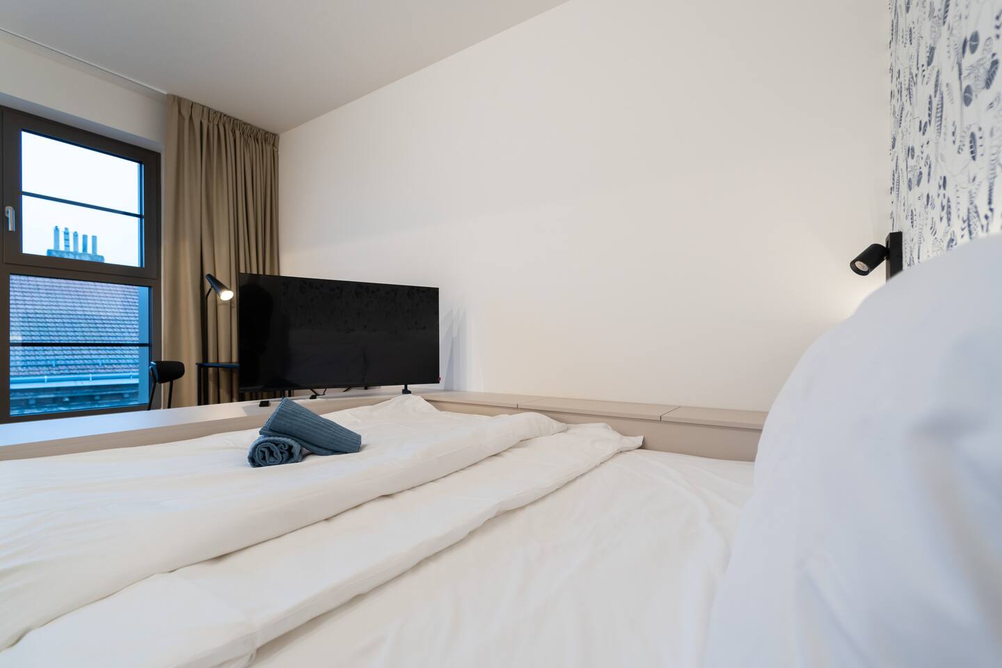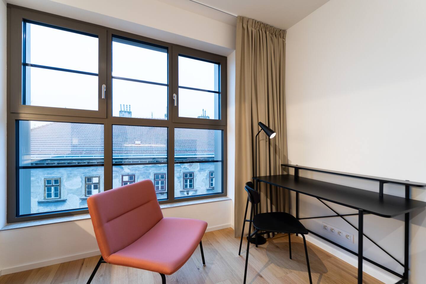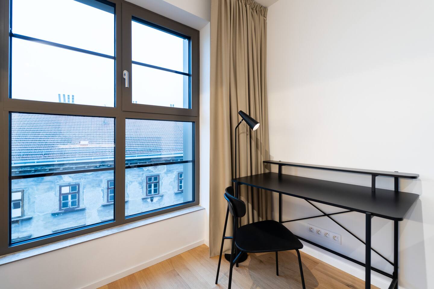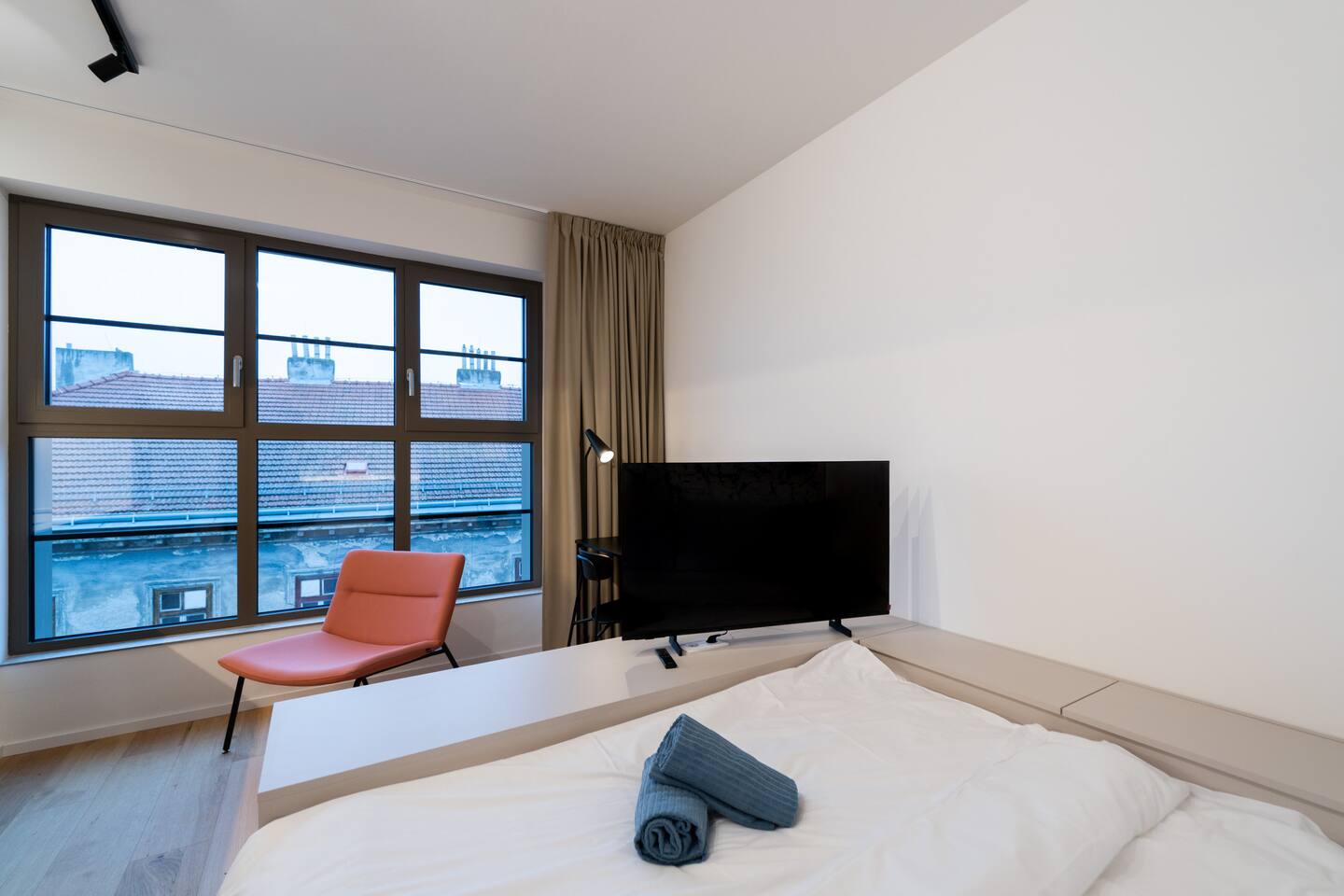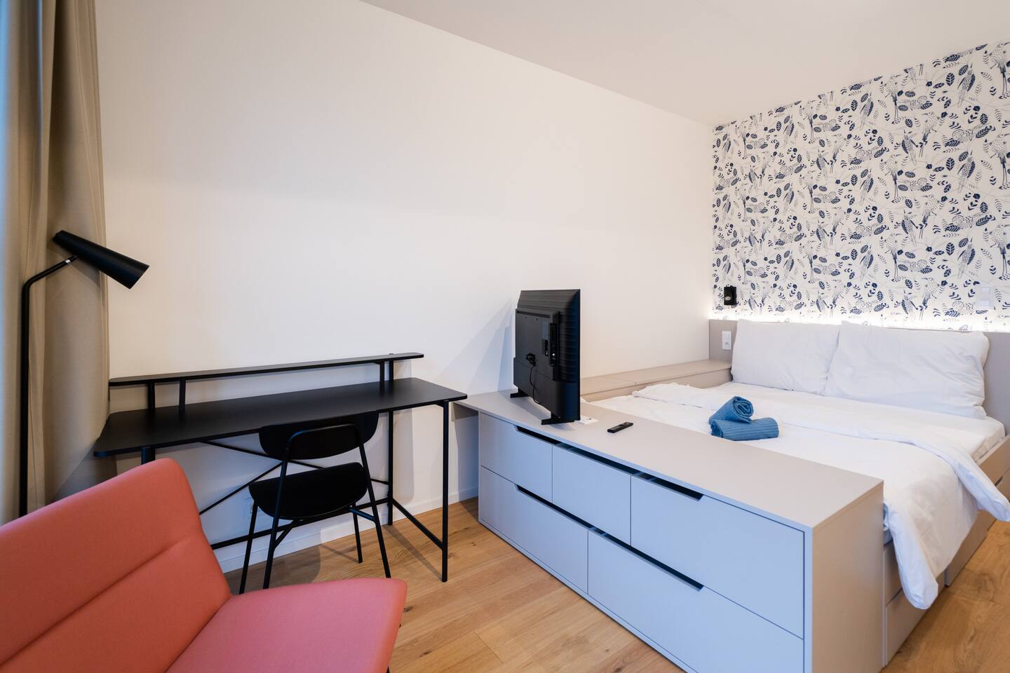 Indigo Boutique Studio is a stylish studio for two, designed in calm, deeper tones that create a serene atmosphere. A full-wall window provides natural light while maintaining a cosy, intimate feel. The residence offers a 24/7 reception as well as an on-site bakery and café with excellent breakfast options. Guests can enjoy free fitness access in the building and on-site bakery & café services. TV, Wi-Fi, private bathroom and shower included. No pets, smoking or parties.